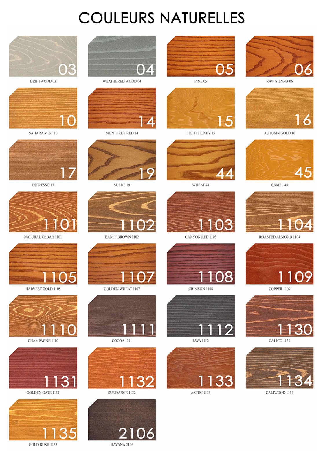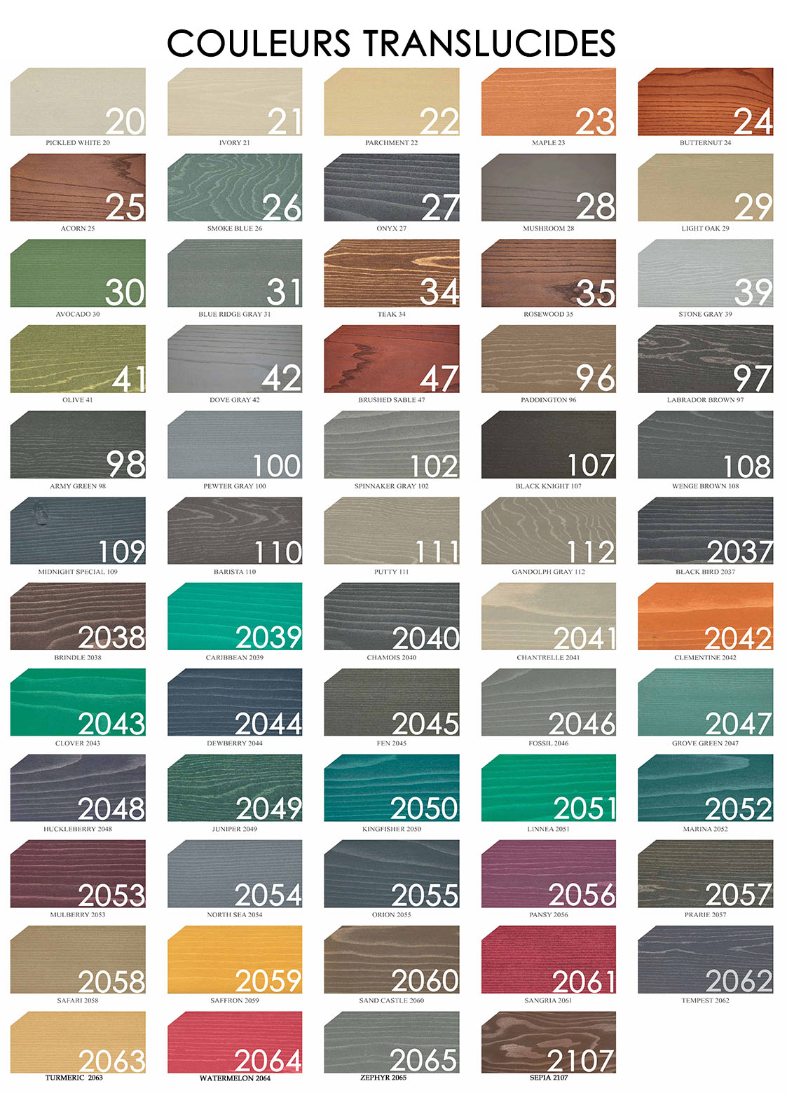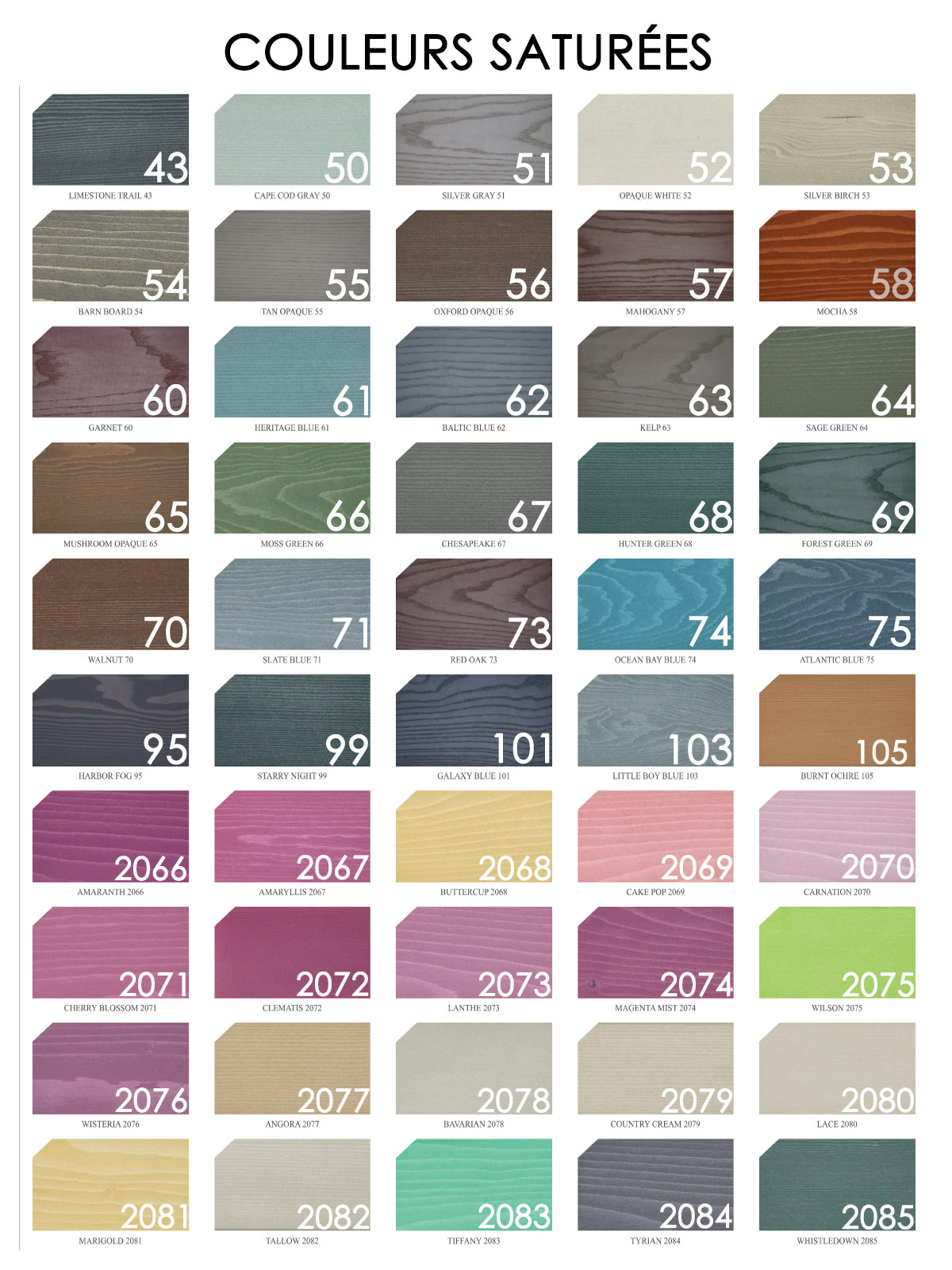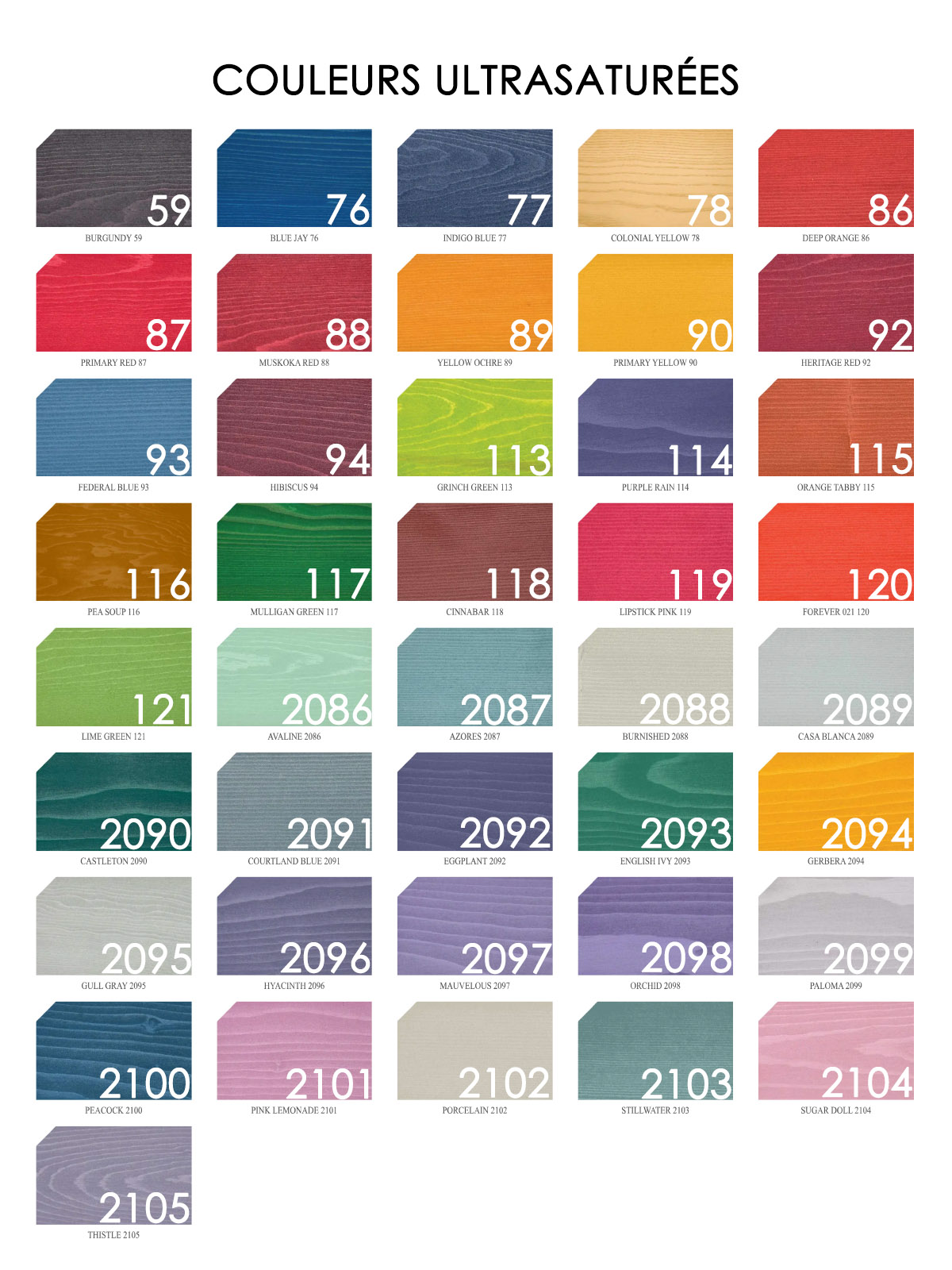 Bois des Marées 03, Bois Délavé 04, Pin 05, Sierra Brut 06, Brume du Sahara 10, Rouge Monterey 14, Miel Doux 15, Automne d'Or 16, Espresso 17, Suède 19, Blé 44, Chameau 45, Cèdre Naturel 1101, Brun Banff 1102, Rouge Canyon 1103, Amande Grillée 1104, Récolte d'Or 1105, Blé d'Or 1107, Incarnat 1108, Cuivre 1109, Champagne 1110, Cacao 1111, Java 1112, Calico 1130, Golden Gate 1131, Sundance 1132, Aztec 1133, Caliwood 1134, Gold Rush 1135, Havana 2106, Blanc Mariné 20, Blanc Délavé 21, Parchemin 22, Érable 23, Noyer cendré 24, Noisette 25, Sarcelle 26, Onyx 27, Champignon 28, Chêne Pale 29, Avocat 30, Gris blue ridge 31, Teak 34, Palissandre 35, Gris Pierre 39, Olive 41, Gris Falaise 42, Zibeline Rasée 47, Ours en Peluche 96, Brun Labrador 97, Vert Armée 98, Gris Étain 100, Gris Spinnaker 102, Noir chevalier 107, Brun Wengé 108, Spécial Minuit 109, Barista 110, Pâte Moule 111, Gris Gandolf 112, Black Bird 2037, Brindle 2038, Caribbean 2039, Chamois 2040, Chantrelle 2041, Clementine 2042, Clover 2043, Dewberry 2044, Fen 2045, Fossil 2046, Grove Green 2047, Huckleberry 2048, Juniper 2049, Kingfisher 2050, Linnea 2051, Marina 2052, Mulberry 2053, North Sea 2054, Orion 2055, Pansy 2056, Prairie 2057, Safari 2058, Saffron 2059, Sand Castle 2060, Sangria 2061, Tempest 2062, Turmeric 2063, Watermelon 2064, Zephyr 2065, Sepia 2107, Rocaille 43, Gris Cape Cod 50, Gris Argenté 51, Blanc Opaque 52, Bouleau Argenté 53, Bois de Grange 54, Fauve Opaque 55, Marron Grillé 56, Acajou 57, Moka 58, Grenat 60, Heritage Blue 61, Bleu Gaspé 62, Bois Torréfié 63, Vert Sauvage 64, Champignon Opaque 65, Vert Mousse 66, Chesapeake 67, Vert Chasseur 68, Vert forêt 69, Noyer 70, Bleu Ardoise 71, Chêne Rouge 73, Bleu Océanique 74, Bleu Atlantique 75, Brouillard du Port 95, Nuit étoilée 99, Bleu Galaxy 101, Bleu Petit garçon 103, Ocre Brulée 105, Amaranth 2066, Amaryllis 2067, Buttercup 2068, Cake Pop 2069, Carnation 2070, Cherry Blossom 2071, Clematis 2072, Lanthe 2073, Magenta Mist 2074, Wilson 2075, Wisteria 2076, Angora 2077, Bavarian 2078, Country cream 2079, Lace 2080, Marigold 2081, Tallow 2082, Tiffany 2083, Tyrian 2084, Whistledown 2085, Bourgogne 59, Geai Bleu 76, Bleu Indigo 77, Jaune Colonial 78, Orange Foncé 86, Rouge primaire 87, Rouge Muskoka 88, Jaune Sanguine 89, Jaune Soleil 90, Rouge Patrimoine 92, Bleu Opalin 93, Hibiscus 94, Vert Grinch 113, Pluie Mauve 114, Tabby Orange 115, Soupe au Pois 116, Vert Mulligan 117, Cinnabar 118, Rouge à Lèvre Rose 119, Toujours 021 120, Lime Green 121, Avaline 2086, Azores 2087, Burnished 2088, Casa Blanca 2089, Castleton 2090, Courtland Blue 2091, Eggplant 2092, English Ivy 2093, Gerbera 2094, Gull Gray 2095, Hyacinth 2096, Mauvelous 2097, Orchid 2098, Paloma 2099, Peacok 2100, Pink Lemonade 2101, Porcelain 2102, Stillwater 2103, Sugar Doll 2104, Thistle 2105